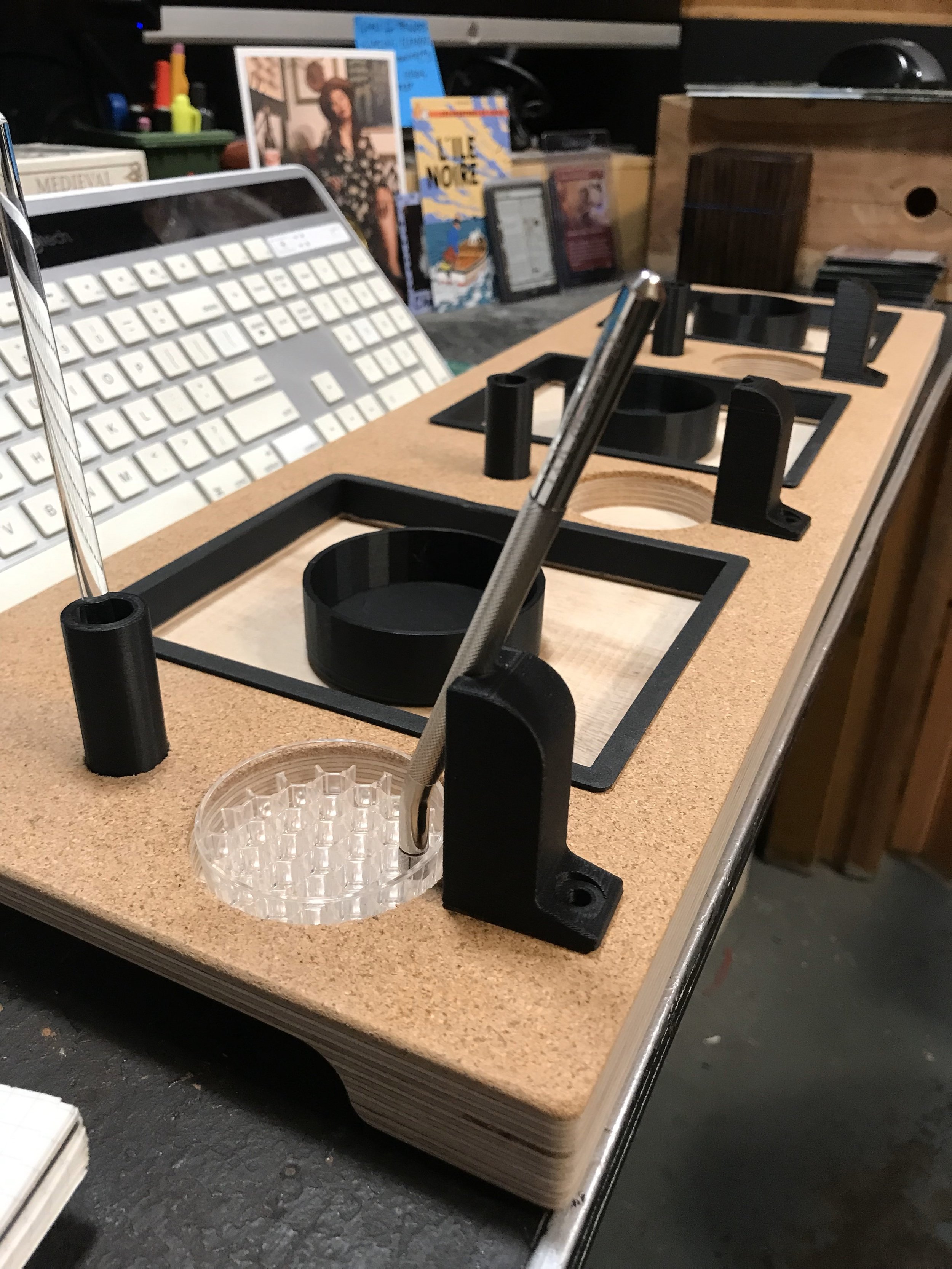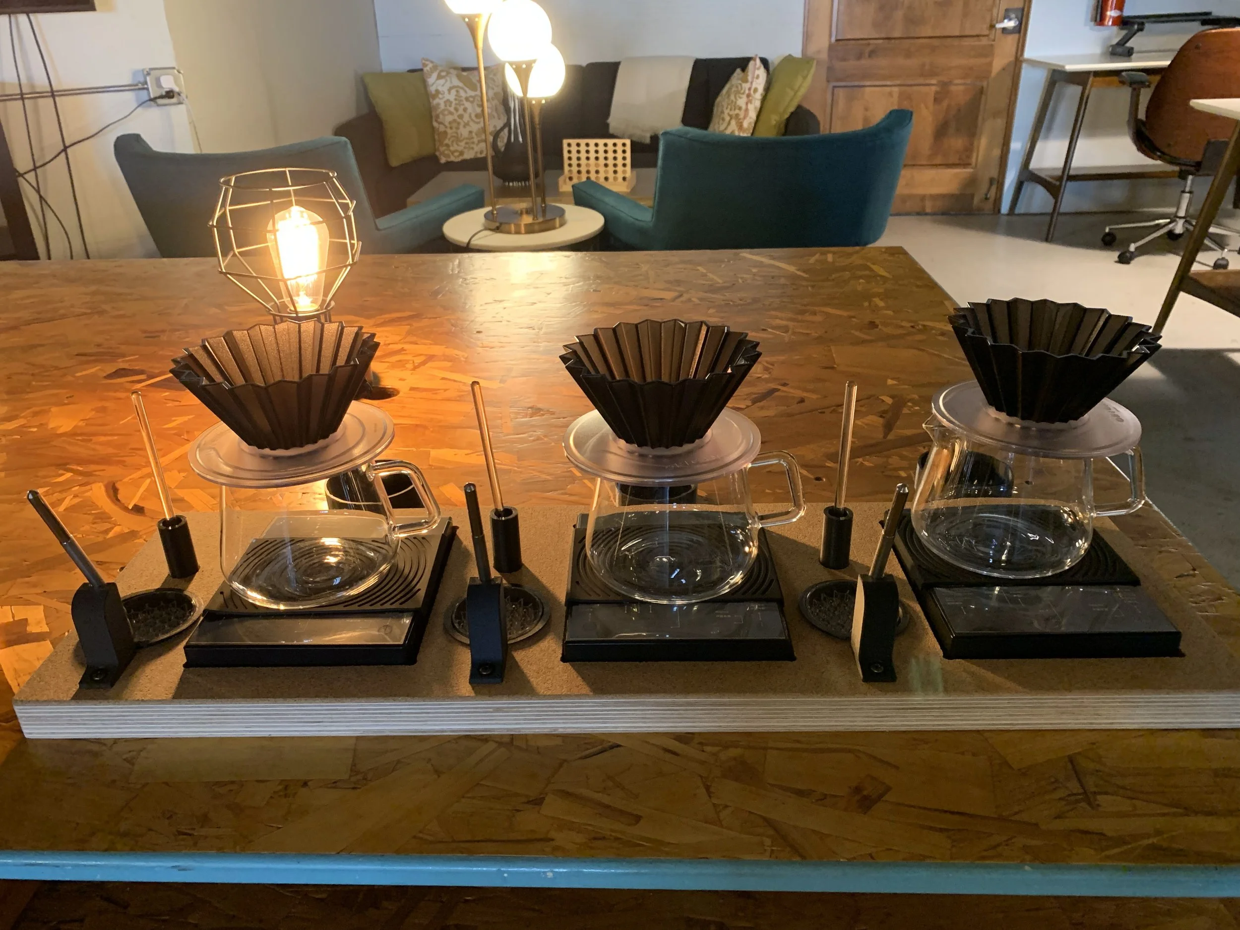 Designed and built this stand to facilitate a coffee presentation by Chris Casassa at U.S. Brewer’s Cup & April Brewer’s Cup. This stand featured caddies for brewing implements and scales to allow 3 batches of coffee to be brewed simultaneously. Main goals for this build were to create a compact stand that would travel easily and primarily give the brewer an ergonomic work station.